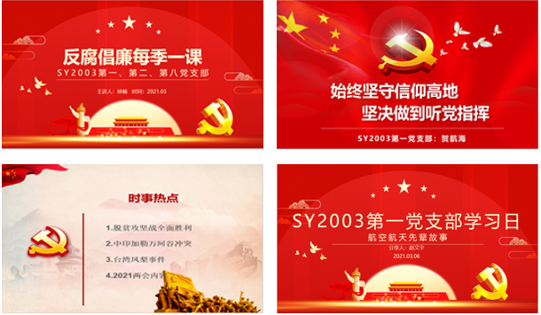 2021年3月6日,SY2003第一,第二和第八党支部联合在腾讯会议上以反腐倡廉,民族信仰,时事热点和航空航天先辈事迹为主题开展了集中学习。会议由支部书记林畅主持,林畅,贺航海,赵文宇和申佳军四位同学作为主讲人进行了分享,会议应到28人,实到27人。